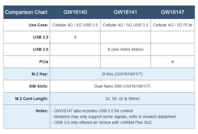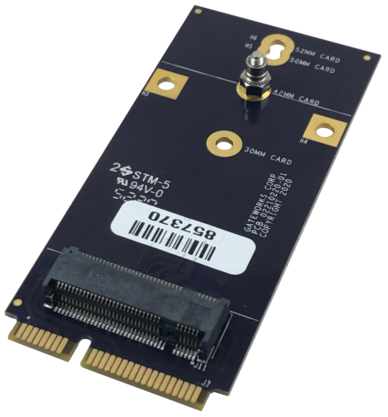 The GW16140/GW16141/GW16147 are Mini-PCIe to M.2 Adapters designed to allow support of M.2 Cellular Modems and other M.2 devices on Gateworks single board computers. Embedded Cellular Modems come in many form factors, including Mini-PCIe and M.2. The GW16140/1/7 adapters allow M.2 B-Key Cellular Modem cards to be plugged into a Mini-PCIe slot on a Gateworks Single Board Computer.